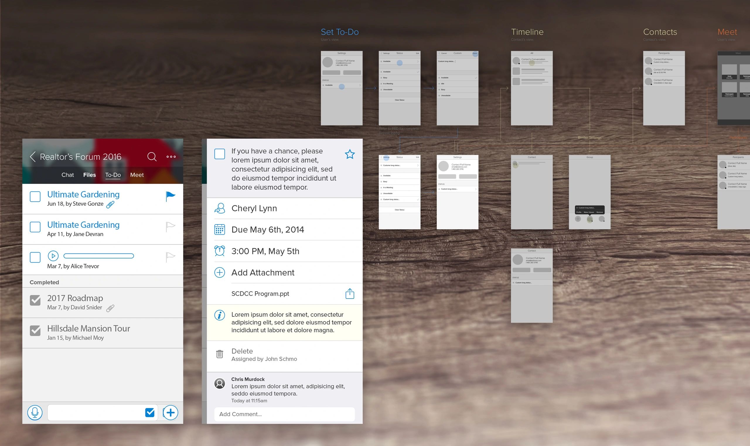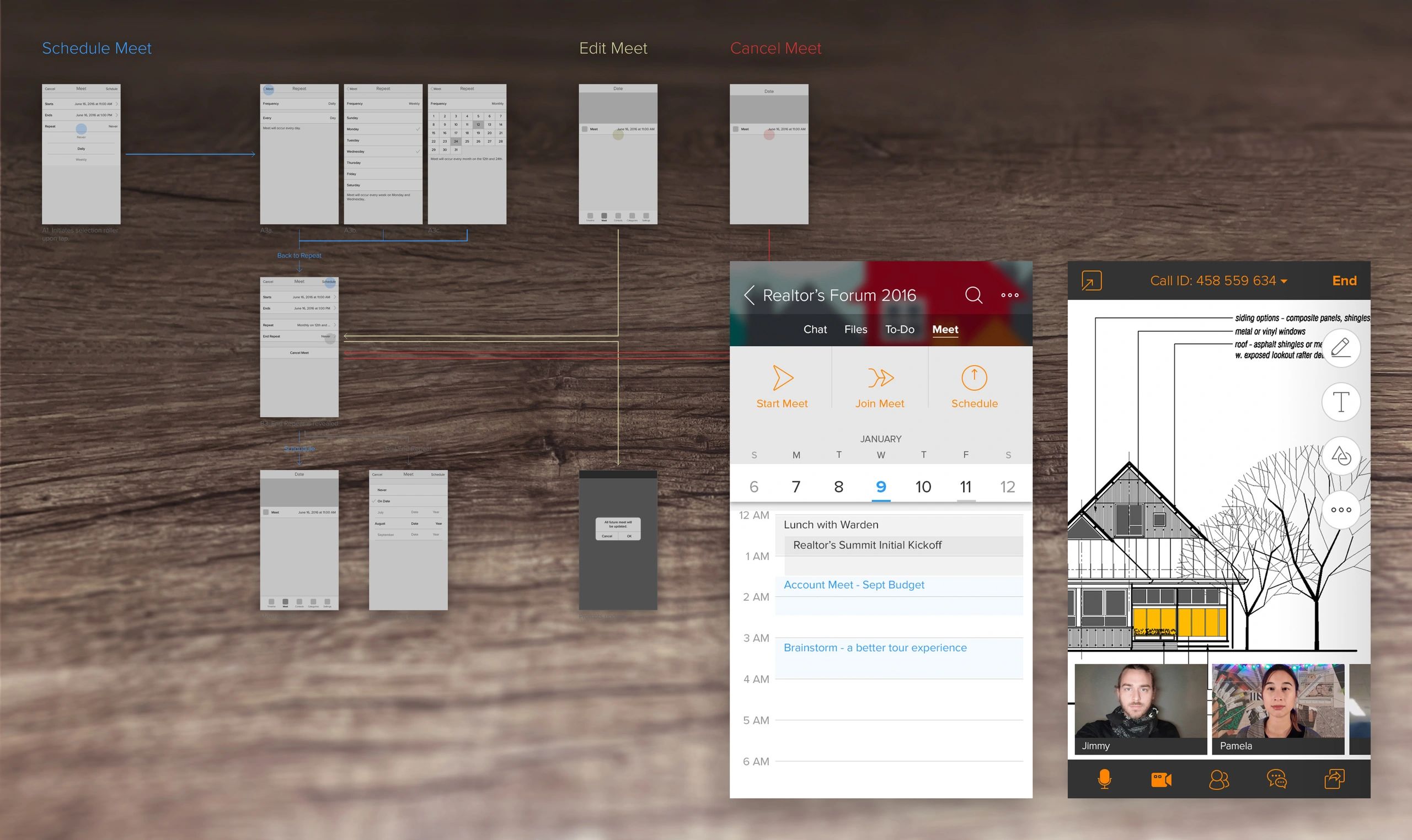 As the demand for tasks and online meetings grew, we responded quickly. Flowcharts were devised to accommodate to-do assignments and meeting statuses and how each UX flow could fit intuitively with the Moxtra experience. To-do UI provides comprehensive detail about task assignments, and within the meeting we leveraged screen-sharing, video conferencing, and our unified file annotation tools to help provide a rich virtual meet. Each feature could be quickly accessed via simple swipes of the mobile display.